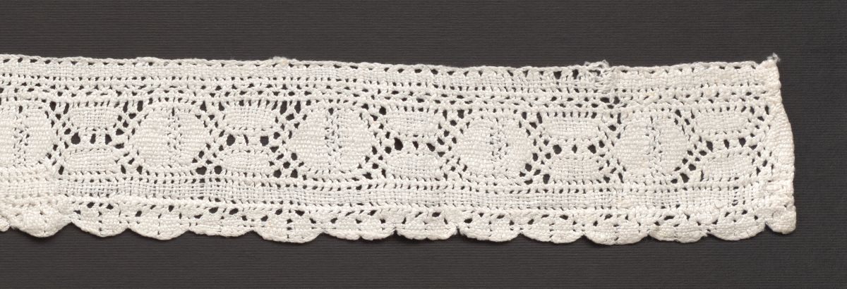 Multi-pair lace, Hontiansky type. Material white cotton threads, plain weave and knit stitches, circular motifs. Flat teeth on the outer edge.