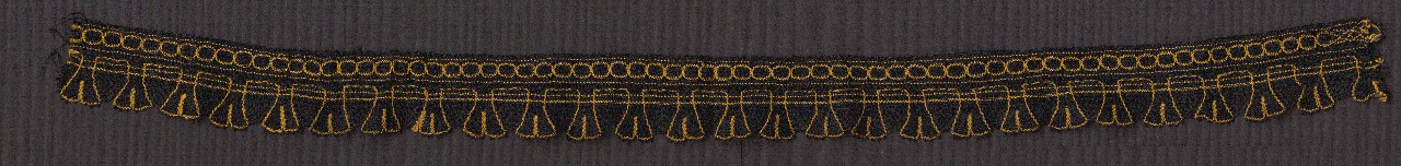Bobbin lace with many pairs, type Novo Mesto. The lace is made of black and contrasting yellow wool yarn. It consists of two parts. The bottom part has teeth and a narrow insert with a motif of eights sewn to it.