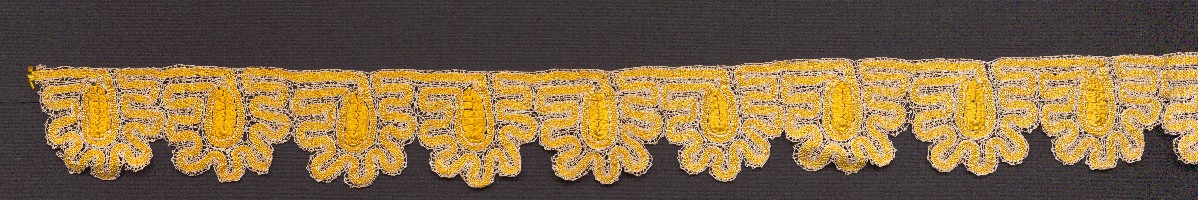 Bobbin lace with teeth, Slovak Grobský type. Made from cotton thread for sewing and yellow silk thread. Patterns include squares, braids, little squares. Little squares are arranged in a typical way for Slovak Grob.