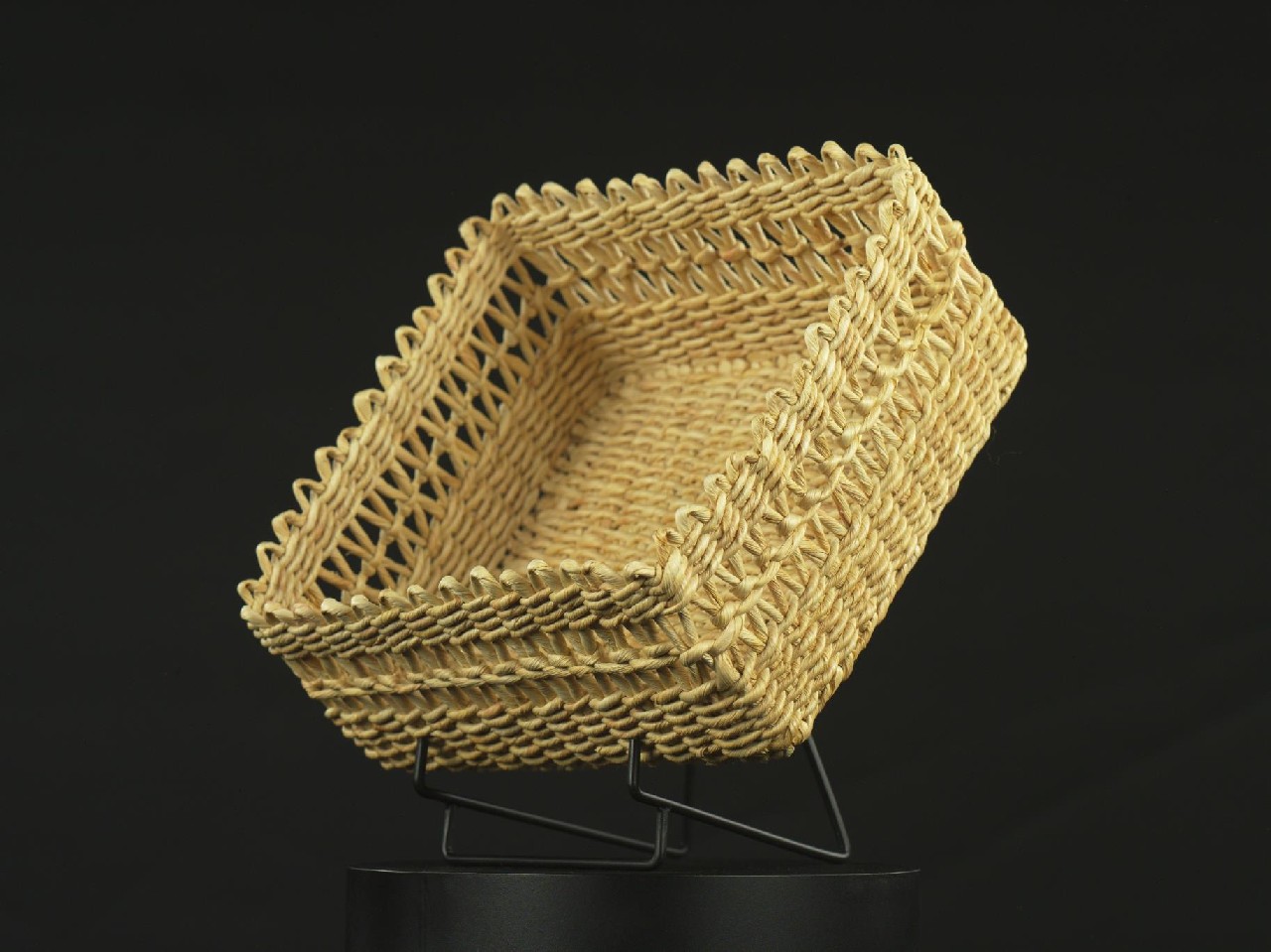 The basket is woven from thin strips of wicker, square-shaped with decorative weaving.