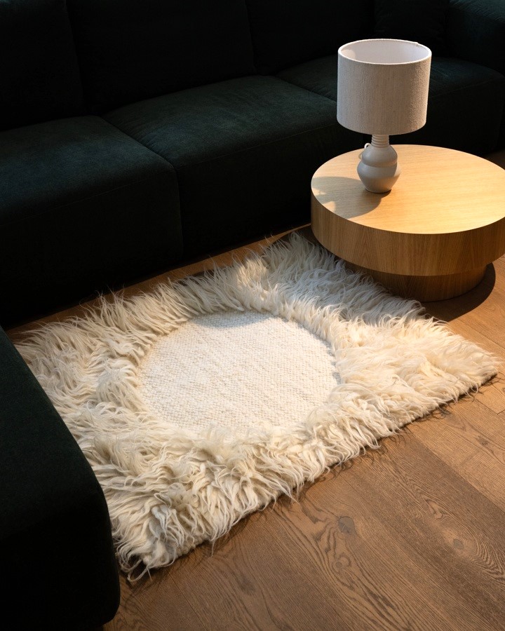 Hand-woven rug with dense long sheep wool emphasizing geometric composition and relief surface. Natural sheep wool from Slovakia was used in production.