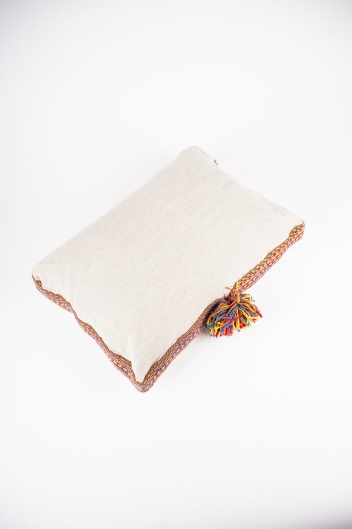 The flax pillow is complemented by a woven tape. The tape is handmade using the tablet weaving technique with merino sheep wool.