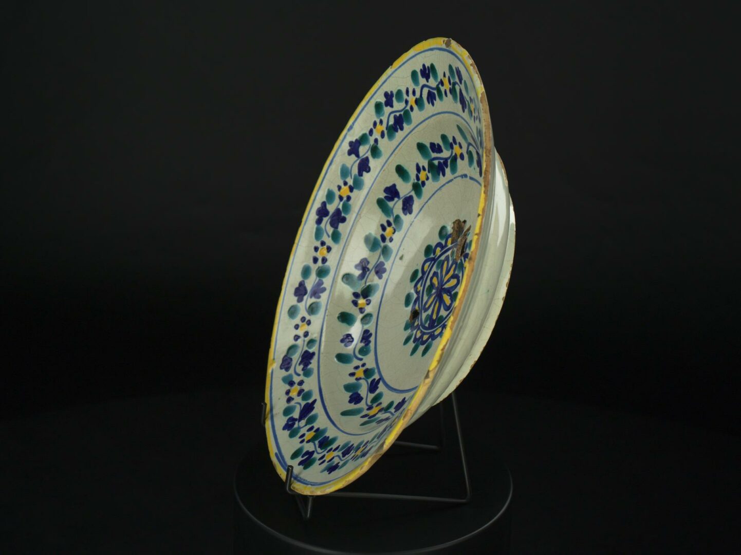 A plate made of pale clay, thrown on a wheel. Low walls are slightly concave at the edge. Decoration: a flower with petals at the bottom, two floral bands around the circumference. Coloration: blue, green, yellow, white underlying glaze. Unmarked. Damaged/perforated bottom in three places, edges lined.