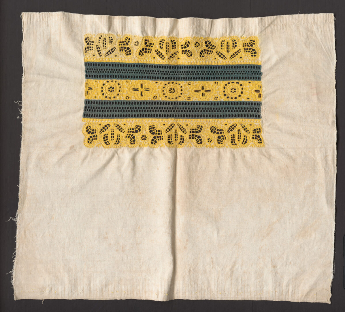 A split sleeve made from women’s sleeves is embroidered with a crooked needle in the upper part. The neckline embroidery is sewn with cotton thread, in yellow and dark green.