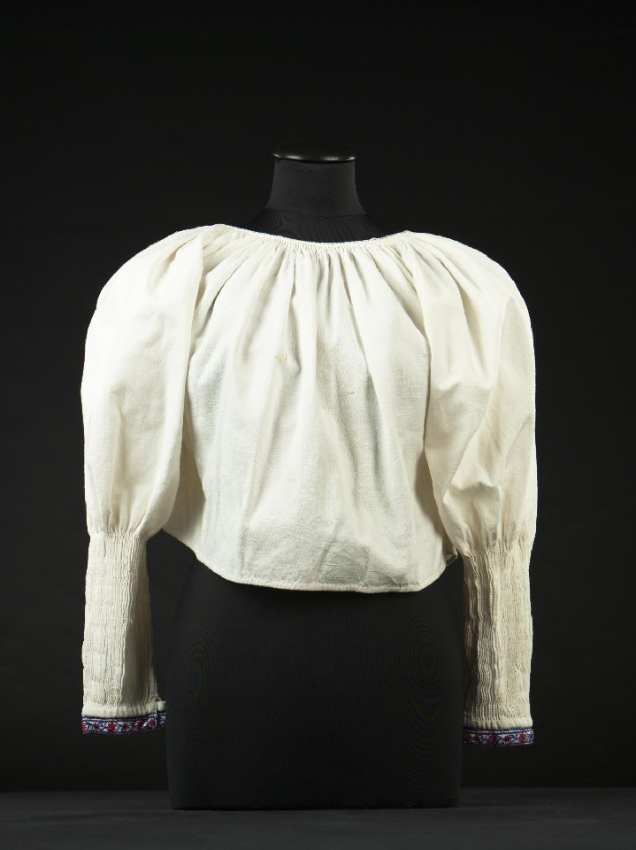 The sleeves are sewn from homemade cotton canvas, the handle part from a thinner fabric, the sleeves from a denser one. The upper part is pleated and sewn into a small collar, which is quilted in the center with blue cotton thread. The sleeves are pleated at the bottom with 6 threads above each other and sewn into a cuff. Patterned fabric is attached to the cuffs, above which one row of blanket stitch is embroidered.