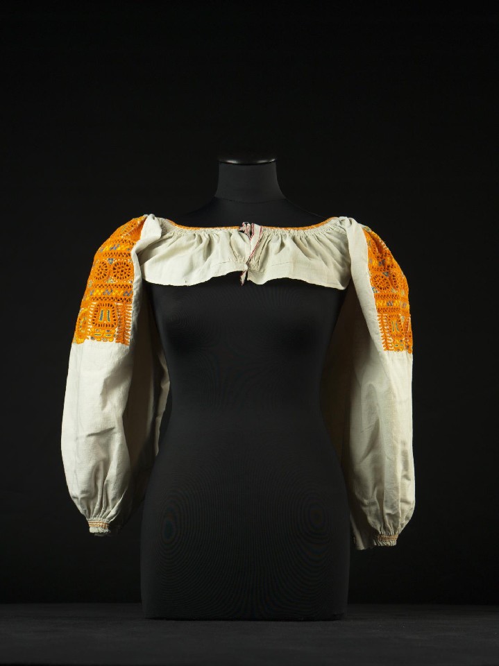 Sleeves are sewn from two types of fabric, with the sleeves made from a thicker one and the front and back pieces from a thinner store-bought one. The sleeves are stitched with a curved needle using thicker cotton thread. The narrow collar is embroidered with little crosses. The sleeve ends are pleated, with a strip of fabric sewn over the pleats.