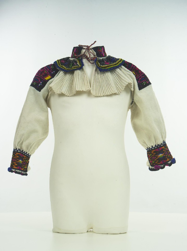 Sleeves made of homemade canvas have sleeves, a collar, and neckline embroidered with wool yarn. The collar is embroidered with crosses, the sleeve ends have gathers reinforced with embroidery. The upper part of the sleeves features a composition embroidered with French knots, stem stitch, and satin stitch. The collar has a lace made of needle-sewn net attached. Wool braids are attached to the collar itself. The edge of the neckline is lined with fabric scallops. The sleeves are gathered.
