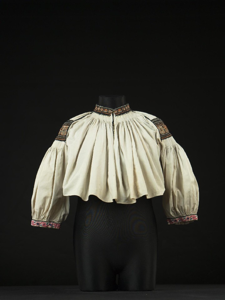 The sleeves are made of factory canvas. They have embroidery sewn with cotton thread on the sleeve straps and on the collar. Used stitches: running stitch, open chain stitch, loop stitch, stem stitch, satin stitch. The ruffles under the collar and at the ends of the sleeves are reinforced with embroidery. The ends of the sleeves are sewn into a cuff, with the outer part made of factory fabric.