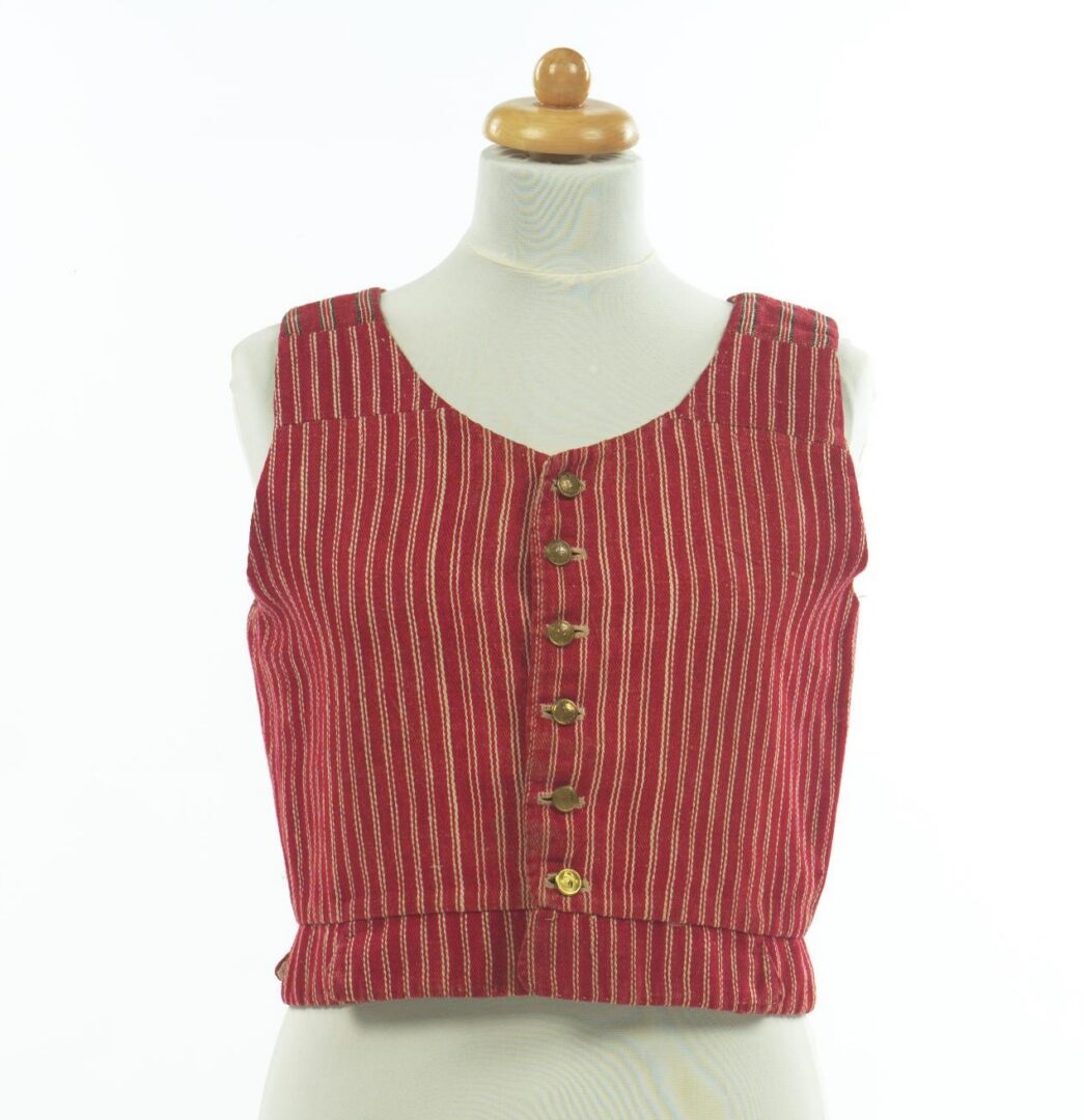 The coat is tailored from hand-woven mixed keper fabric (linen warp, cotton weft), with red surface interrupted by narrow white stripes. The lining is made of coarse linen canvas. It fastens with metal buttons, adorned with gold-colored miner motifs.