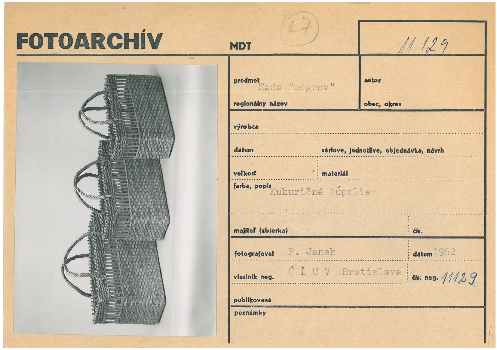 V 60. a 70. rokoch minulého storočia sa v ÚĽUV-e mimoriadne darilo výrobe produktov zo šúpolia. Najväčšími strediskami výroby boli obce v okresoch Nové Zámky a Komárno. Vyrábali sa rohože, podložky, košíky, kazety, tašky, klobúky, sandále a opletali fľaše. Pôvod tejto výroby siaha až do 30. a 40. rokov, kedy sa v spracovaní šúpolia vyškolilo prostredníctvom kurzov domáckej výroby niekoľko tisíc výrobkýň. Pre ÚĽUV začali pracovať od roku 1957 v jednotlivých strediskách, kde sa počty výrobkýň pohybovali v rozmedzí od 30 do 500. Najväčšiu popularitu získali obľúbené tašky, pomenované podľa tradičných mäsiarskych tašiek zvaných cégre, pôvodne vyrábané z močiarnej rastliny pálky úzkolistej.