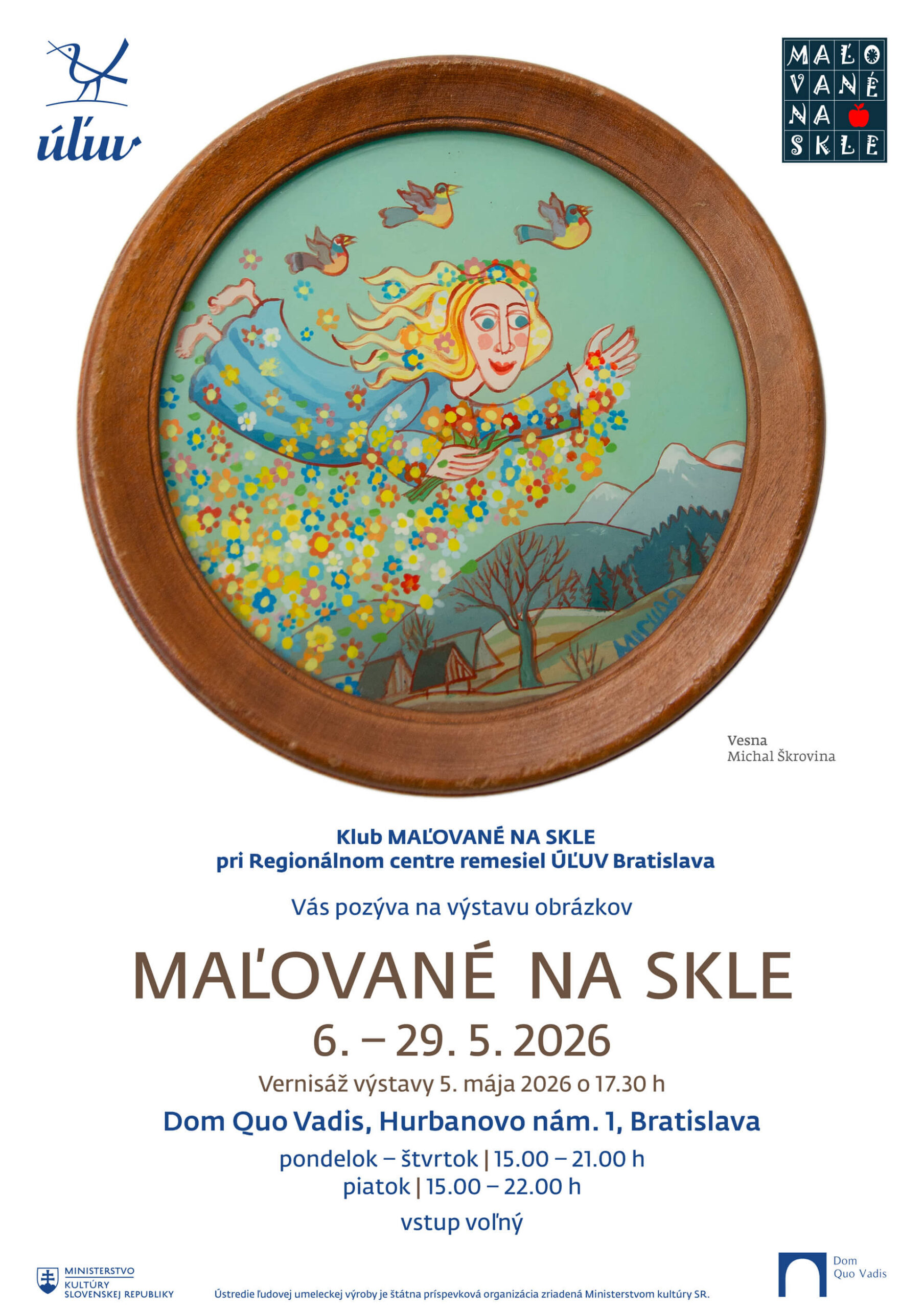 Klub Maľované na skle pri Regionálnom centre remesiel ÚĽUV Bratislava vás pozýva na výstavu obrázkov MAĽOVANÉ NA SKLE, ktorá potrvá od stredy 6. mája do piatka 29. mája 2026 v Dome Quo Vadis na Hurbanovom námestí 1 v Bratislave.