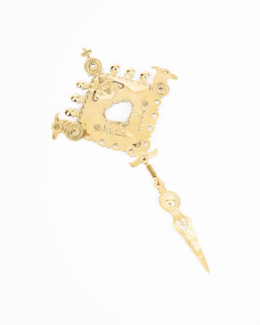 Blanciar vyrezávaný z mosadzného plechu. Základným materiálom je mosadzný plech. Vyzdobený je hlbokým gravírovaním a razením.