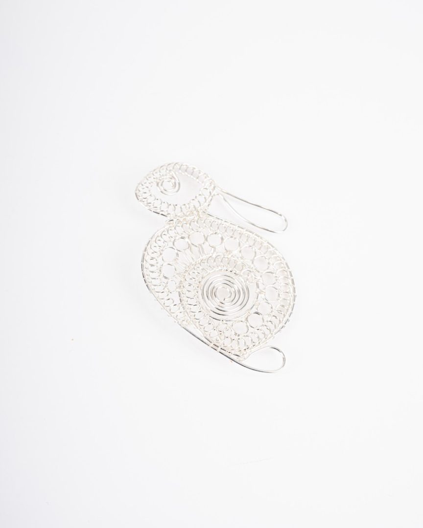 Brošňa z postriebreného drôtu zhotovená tradičnými technikami slučkového výpletu, rozkladaného vzoru a viazania.