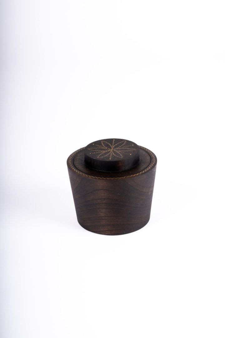 Cukornička drevená, sústružená, s vrchnákom, zdobená vybíjaním.