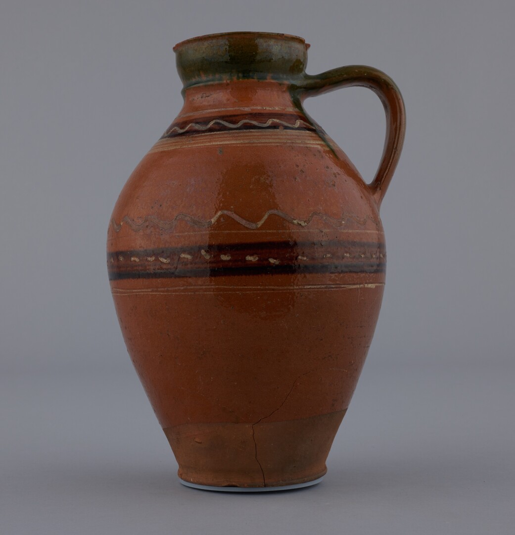 Džbán „hampula“ z červenej hliny. Výduť v polovici výšky, lievikovité hrdlo, ucho vychádza zo spodnej časti hrdla, boky mierne sploštené. Dekor: na výduti a pod hrdlom hnedé pásy a biele vlnovky, hrdlo zelené. Bezfarebná glazúra.