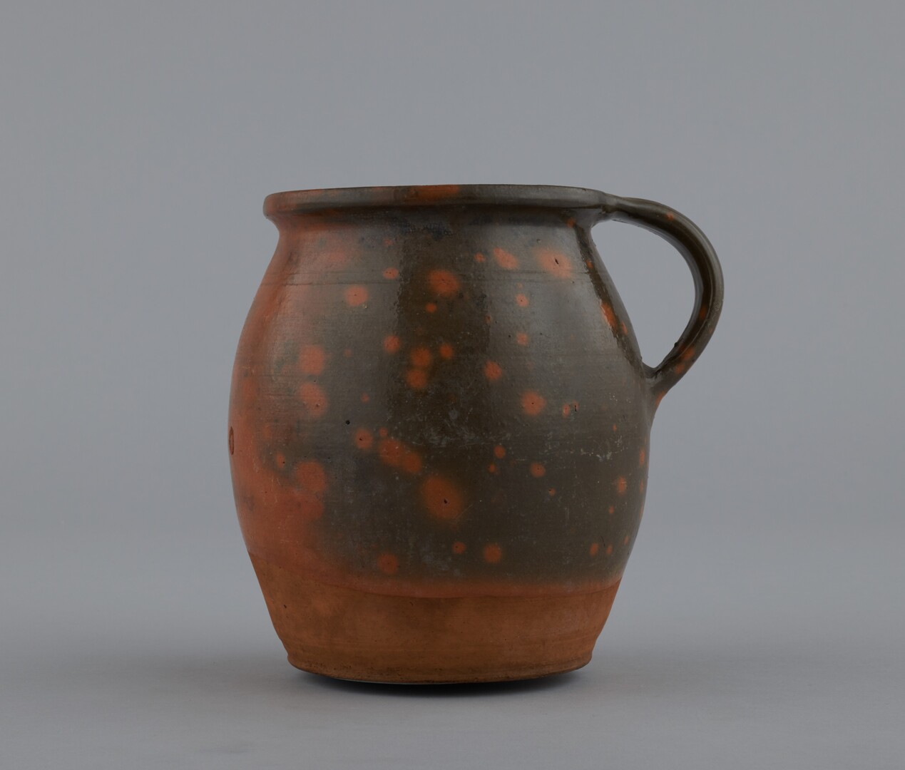 Hrniec keramický, z červenej hliny, točený na kruhu, najširšia výduť v polovici výšky, vyhnutý okraj, ucho vychádza od okraja. Dekor a farebnosť: bodkovaný efekt, ktorý vytvorila glazúra na povrchu pri pálení.