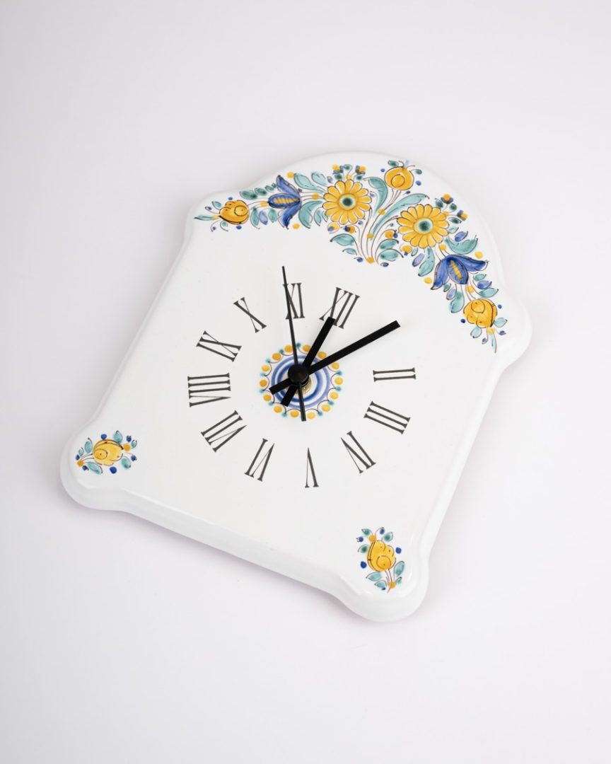 Hodiny zhotovené technikou odlievania do formy, glazované a následne maľované majolikovými farbami.