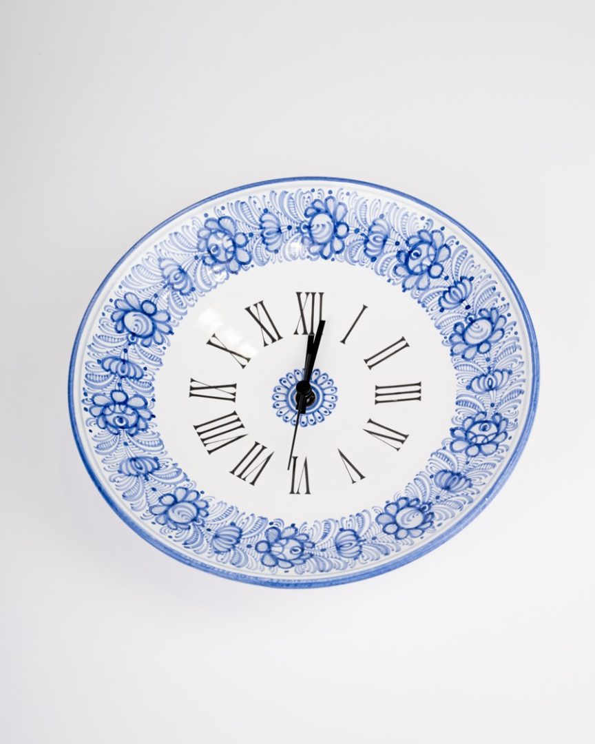 Hodiny zhotovené technikou točenia na kruhu, glazované a následne maľované majolikovými farbami.