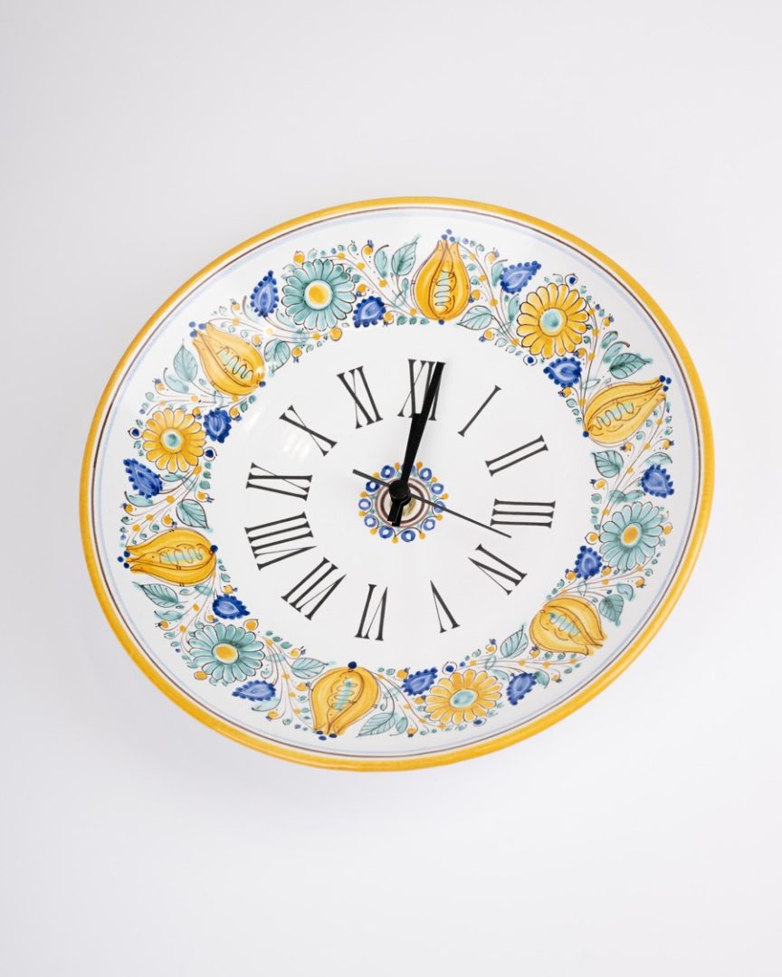 Hodiny zhotovené technikou točenia na kruhu, glazované a následne maľované majolikovými farbami.