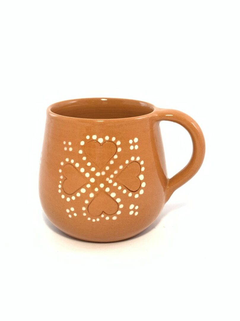 Hrnček s uškom, ručne točený hrnčiarskom kruhu. Zdobený bielou engobou, obojstranne glazovaný priehľadnou glazúrou.