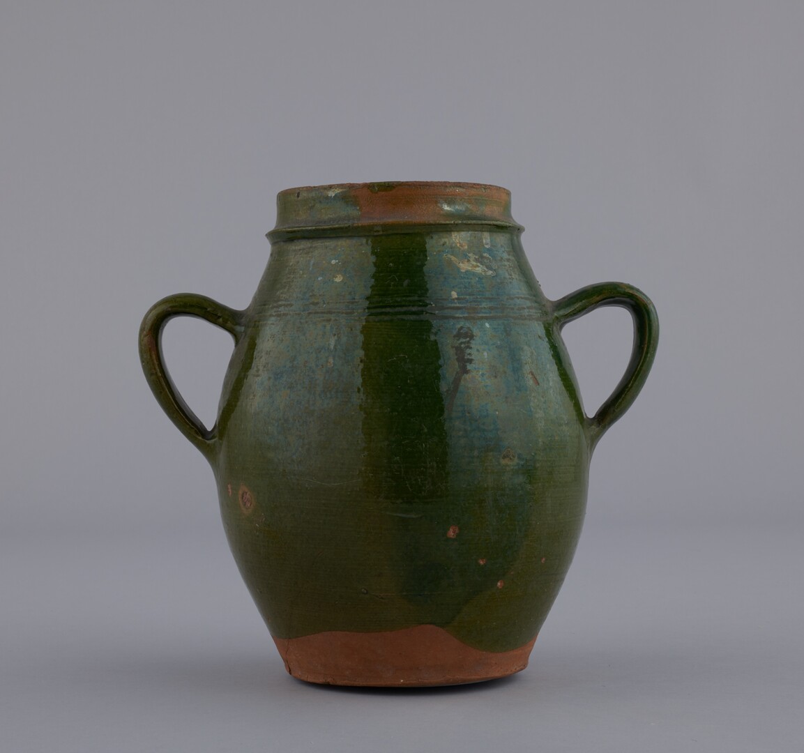 Hrniec keramický zv. muták, z červenej hliny, točený na kruhu, najširšia výduť v polovici výšky, zúžené hrdlo s rovným okrajom a rímsou, dva uši vychádzajú z bočných strán. Zelená glazúra.