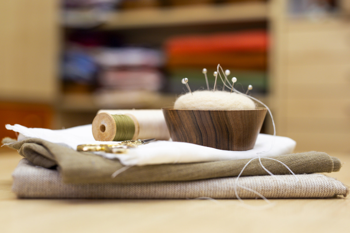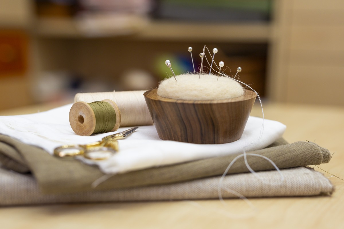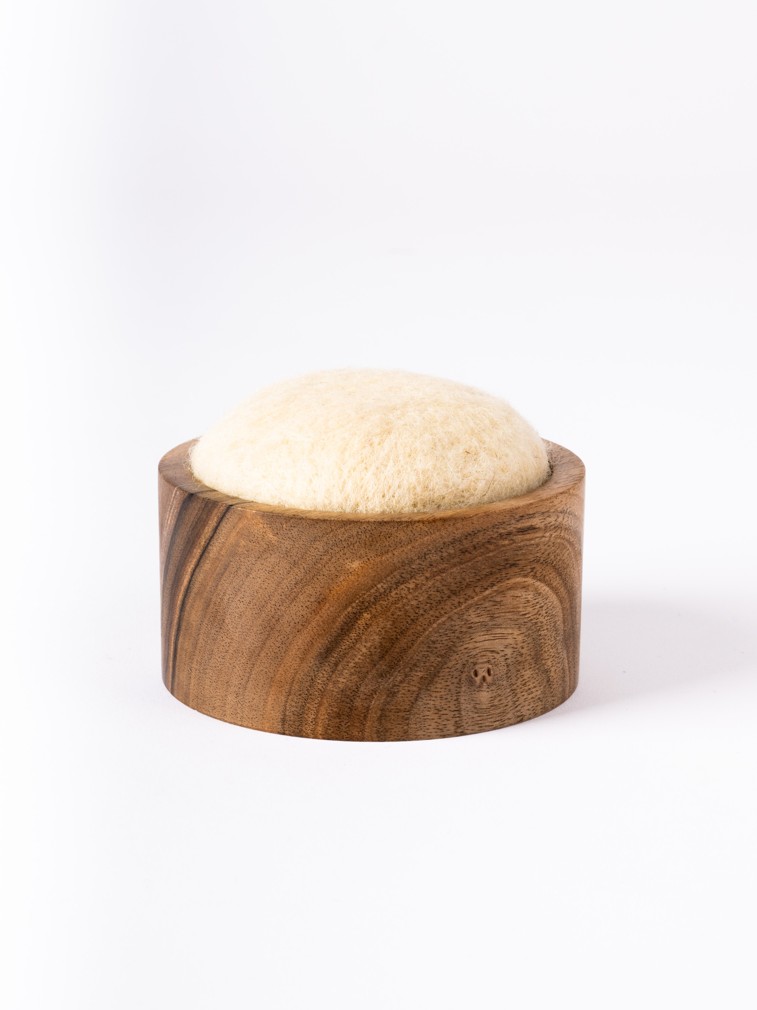 Drevená ihelnička zhotovená dvoma technikami: vysústružený základ z orechového dreva a plstená poduška z domácej ovčej vlny. Povrch dreveného základu je vyleštený tvrdými aj mäkkými voskami.