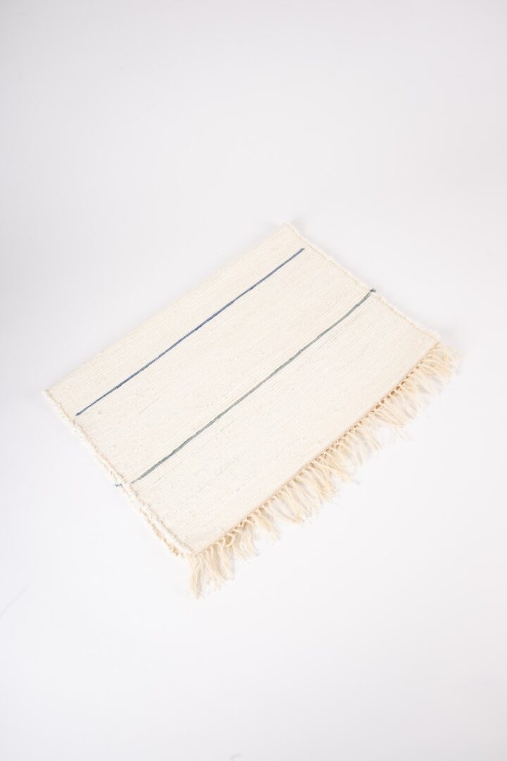 Koberec je zhotovený technikou tkania na krosnách. Do bavlnenej osnovy je zatkávaný ľan, ktorý je zvyškovým materiálom pri výrobe odevov.