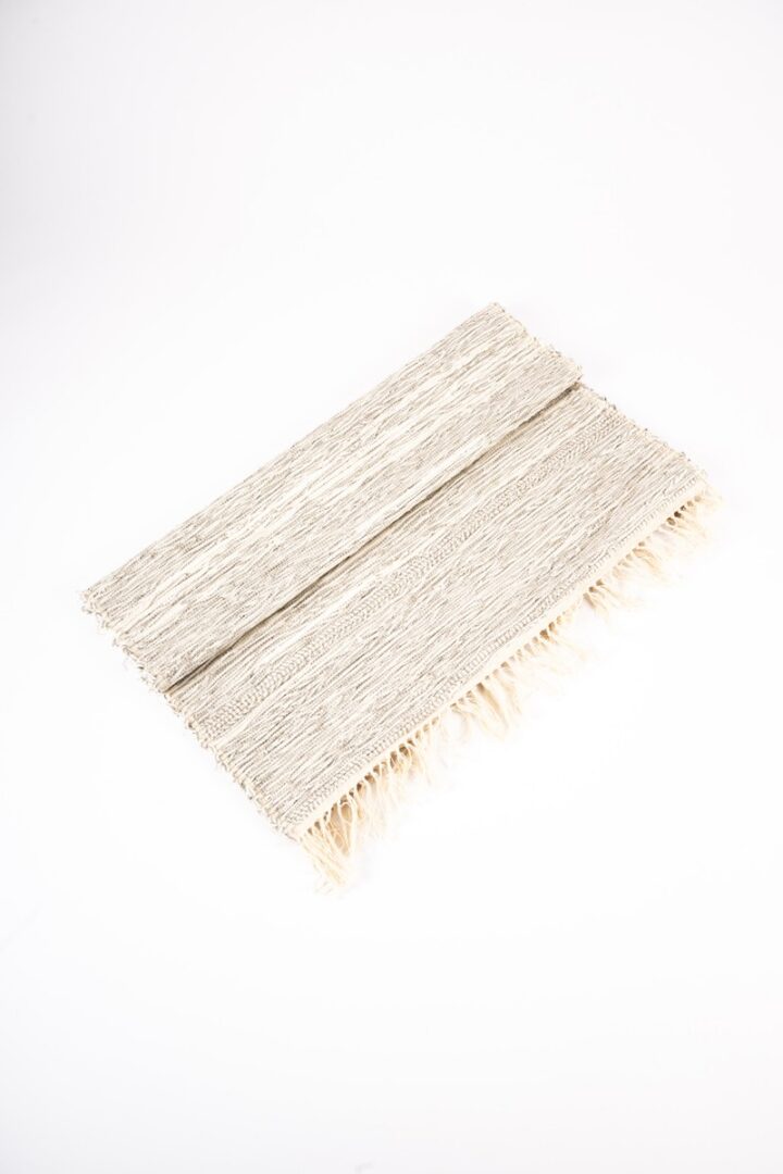 Koberec je zhotovený technikou tkania na krosnách. Do bavlnenej osnovy je zatkávaný ľan, ktorý je zvyškovým materiálom pri výrobe odevov.
