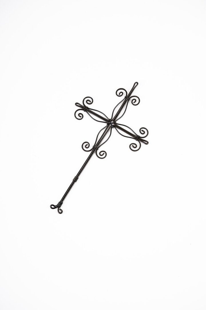 Krížik drôtený z počierneného drôtu zhotovený ohýbaním a viazaním.
