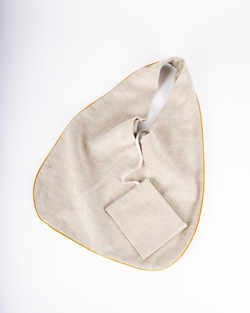 Oválna taška je zhotovená z ľanovej metráže vyššej gramáže. Podšitá je jemným ľanovým plátnom. Po obvode je všitá bavlnená paspula v žltej farbe. Súčasťou tašky je aj menšie vrecko so zipsom, ktoré je uchytené z vnútornej časti.