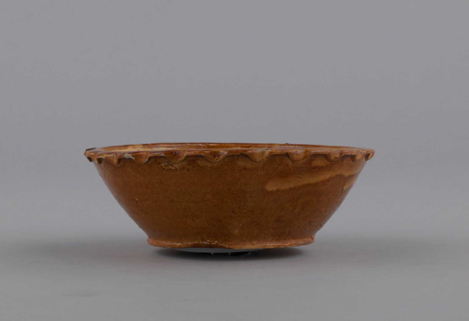 Miska z bielej hliny, točená na kruhu, okraj z vonkajšej strany zvlnený prstom. Vysoké mierne vyduté steny. Dekor: na dne sústredené kruhy, nad dnom po obvode stien obvodové čiary a vlnovka. Farebnosť: hnedá. Zvnútra bezfarebná, zvonku okrová krycia glazúra.