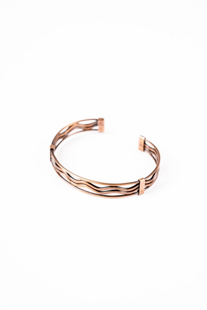 Náramok drôtený zhotovený z tepaného medeného drôtu .