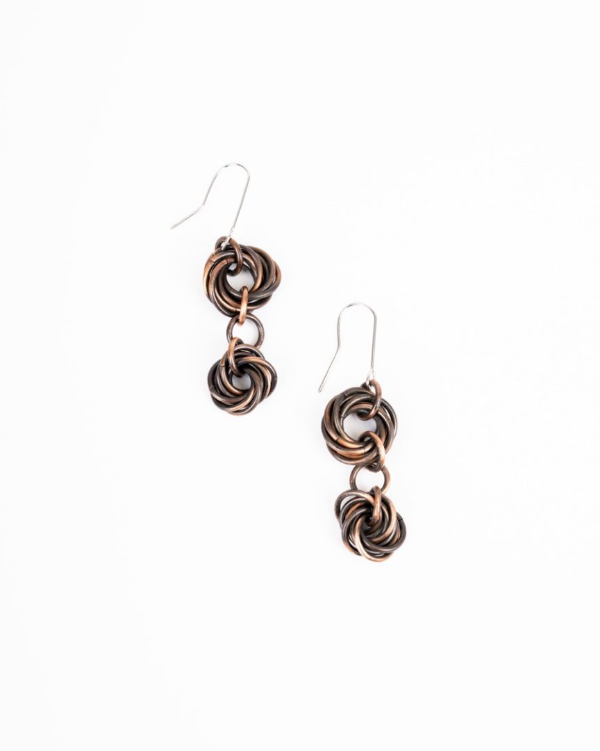 Náušnice zhotovené z medeného drôtu. Skladajú sa z dvoch častí krúžkov.