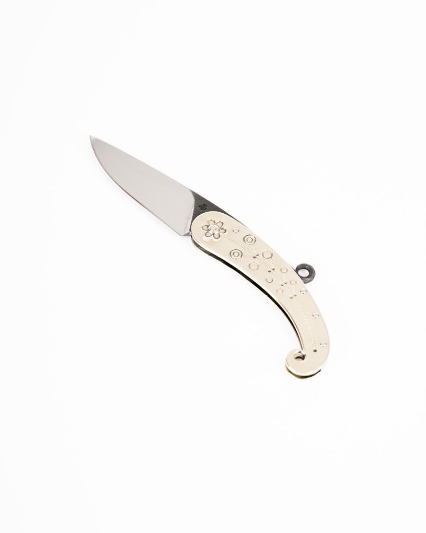 Rúčka vyrobená z alpaky zdobená vyrážaním v tvare slimáka. Čepele zhotovená z ocele N 690.