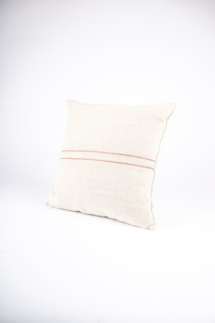 Obliečka na vankúš zhotovená technikou tkania na krosnách. V osnove je použitá bavlna, v útku ručne pradený ľan. Väzba je plátnová, vzor vytvorený preberaním.
