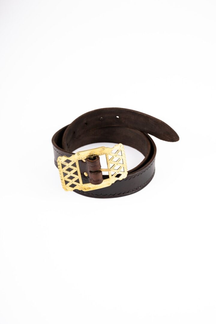 Opasok kožený zhotovený z tmavej hladenice. Zapínanie je na mosadznú pracku. Pracka je zhotovená vyrezávaním a zdobené razením. Opasok je zdobený rádlikom.