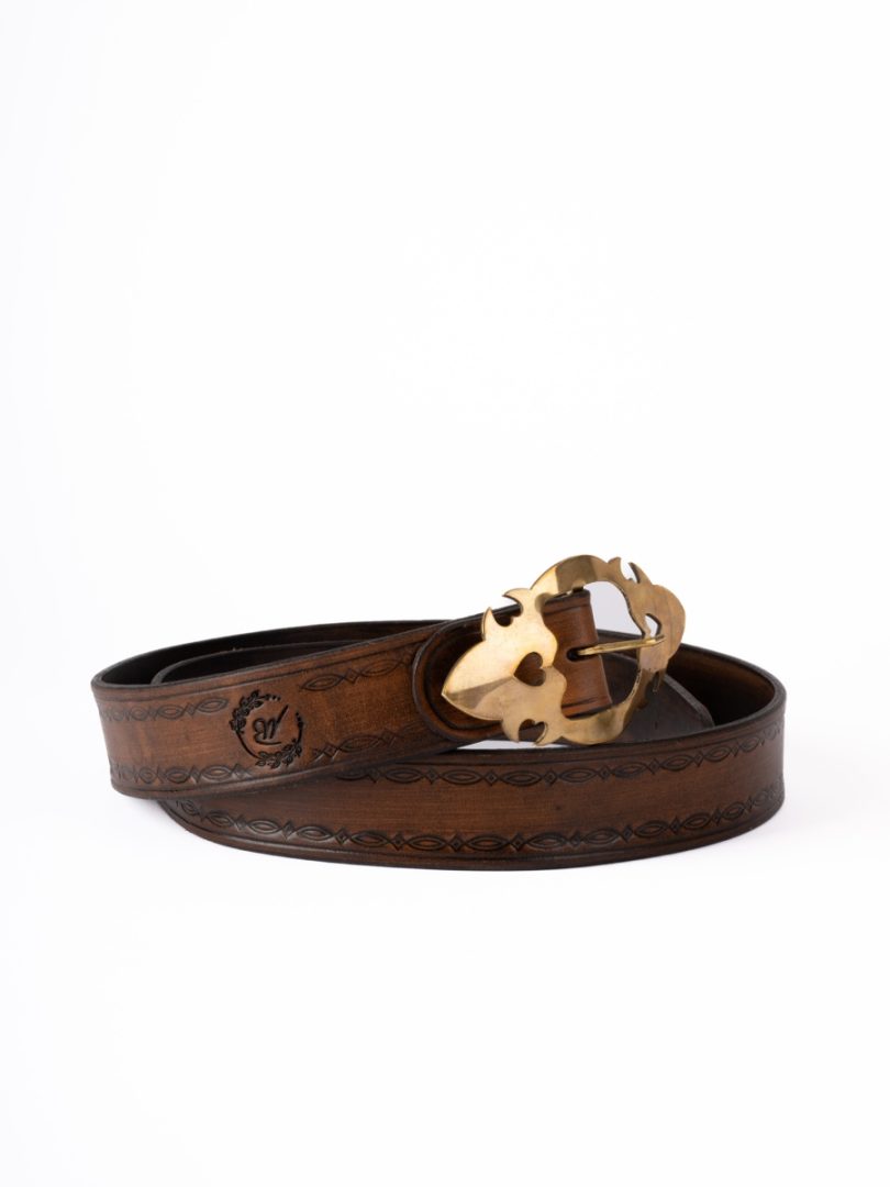 Opasok kožený s mosadnou prackou vyrobený z farbenej hladenice , zdobený raznicami. Hrany opaska sú naglejené a vyhladené.