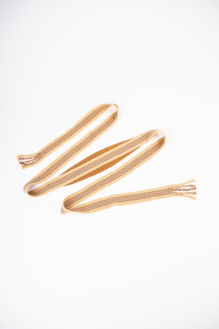 Ľanový opasok s tkanicou z bavlnenej priadze je zhotovených technikou tkania na stužkových krosnách. Výrobok vznikol v rámci workshopu „Ľanové výzvy“, výtvarné konzultácie poskytla Ľubica Poncik.