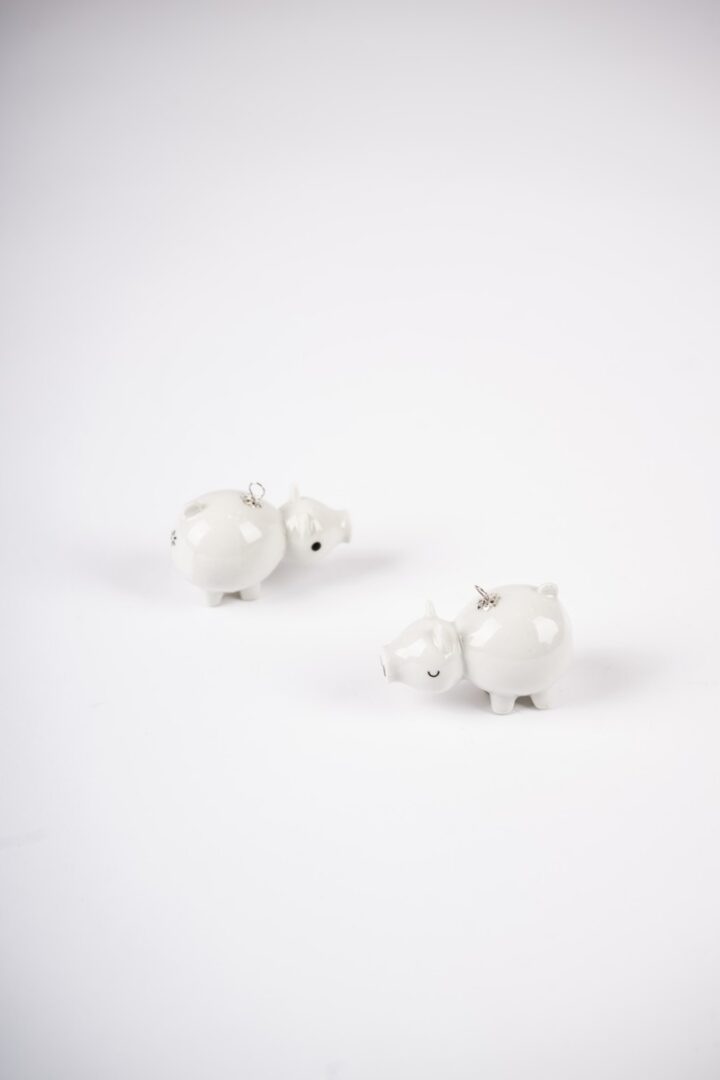 Prasiatko zhotovené z bieleho porcelánu odlievaním do formy. Ručne maľované detaily a glazované.