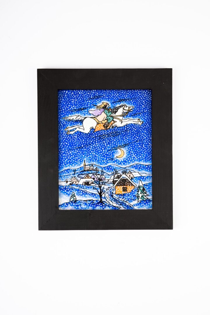 Obraz v drevenom ráme je zhotovený technikou podmaľby na skle. Motív“ sv. Martin nad Vyšným Slavkovom “ je voľnou tvorbou autora.