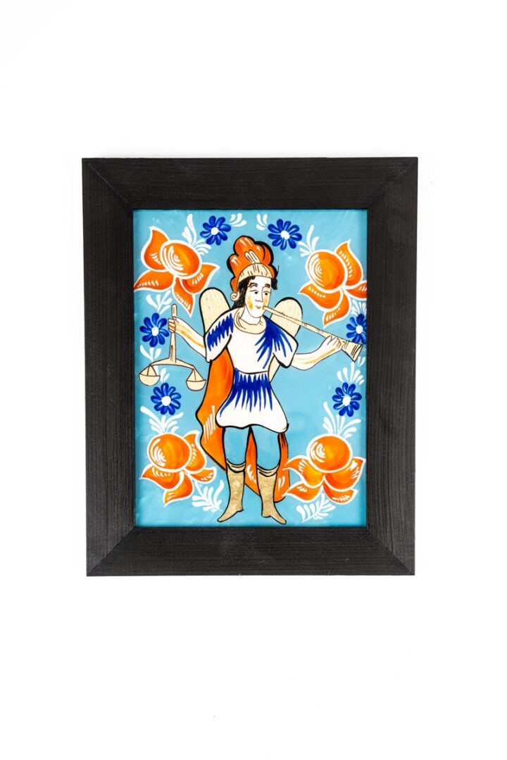 Obraz v drevenom ráme je zhotovený technikou podmaľby na skle. Motív“ Sv. Michal Archanjel “ so zlatou trúbkou a váhami ako atribútmi vo sviežom farebne nezvyčajnom podaní belasého pozadia je voľnou replikou historickej podmaľby na skle. Nájdené v Košických Hámroch.
