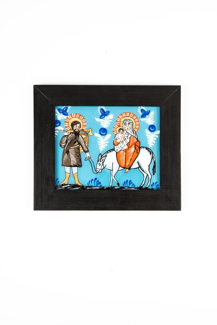 Obraz v drevenom ráme je zhotovený technikou podmaľby na skle. Motív „Útek do Egypta“ je voľnou replikou historickej podmaľby na skle.