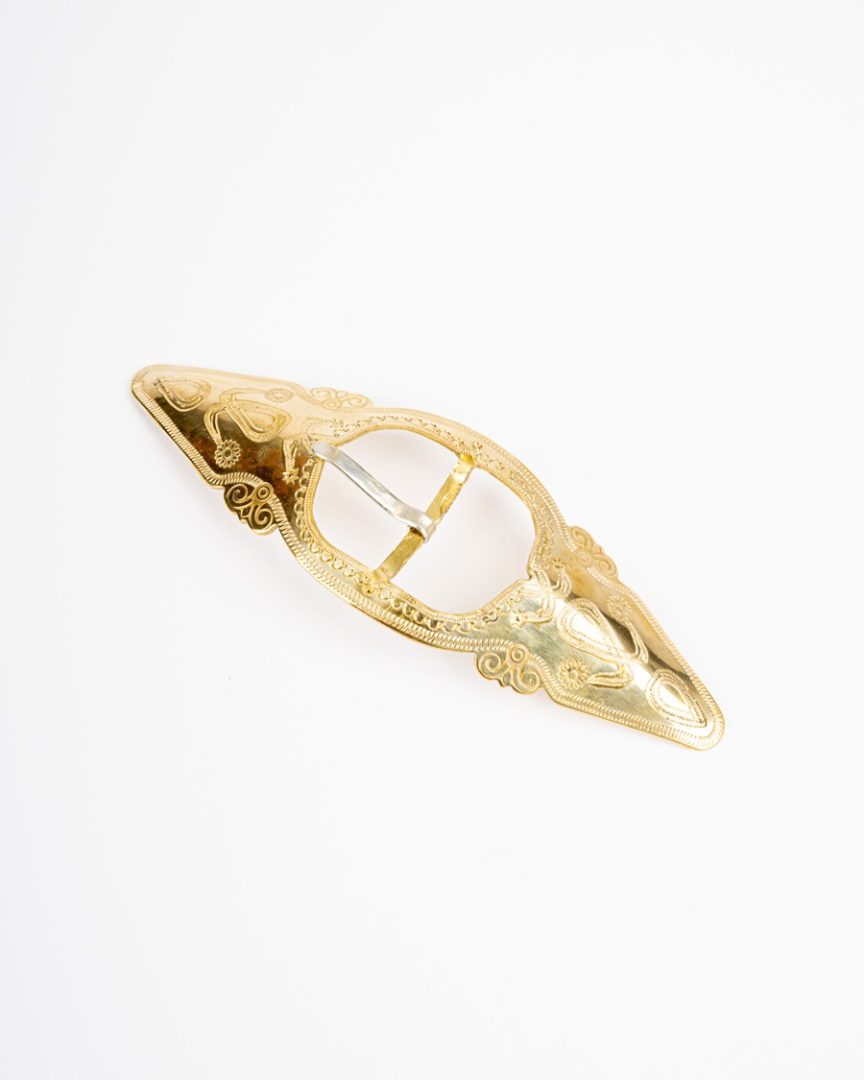Pracka zhotovená z mosadzného plechu s jedným upínacím tŕňom. Výzdobu dopĺňajú razené drobné jednoduché motívy.