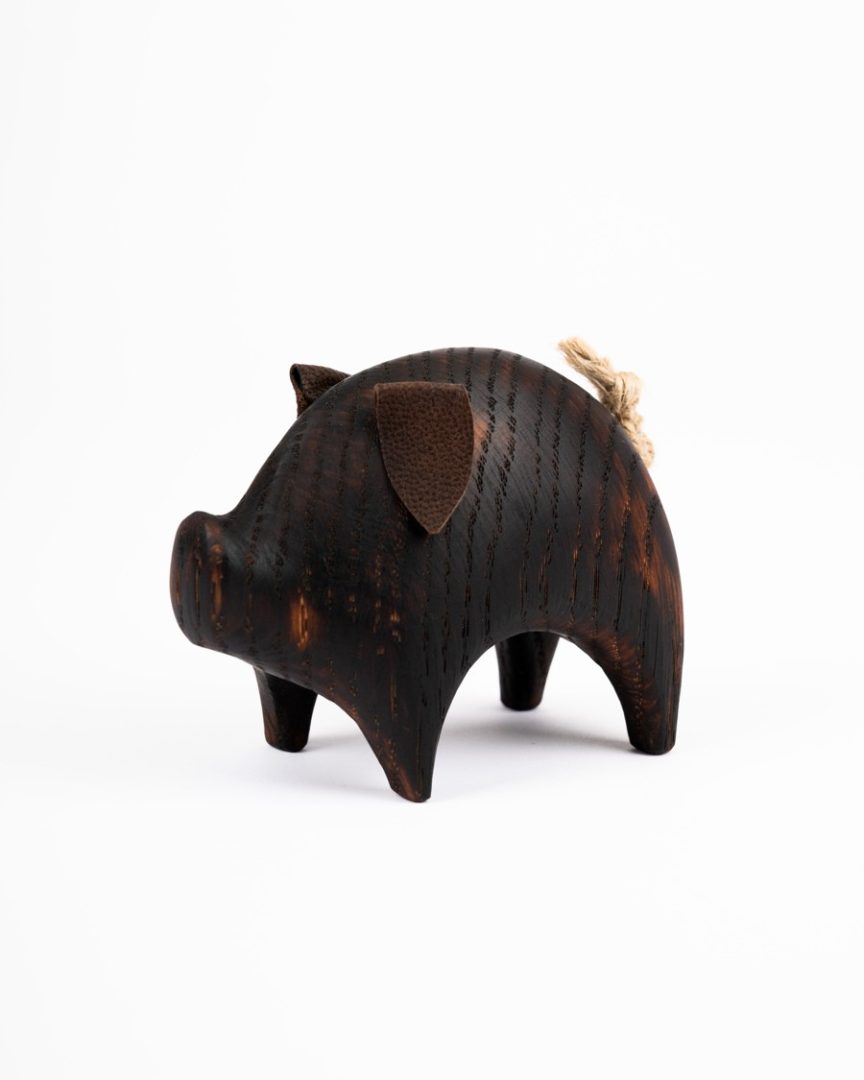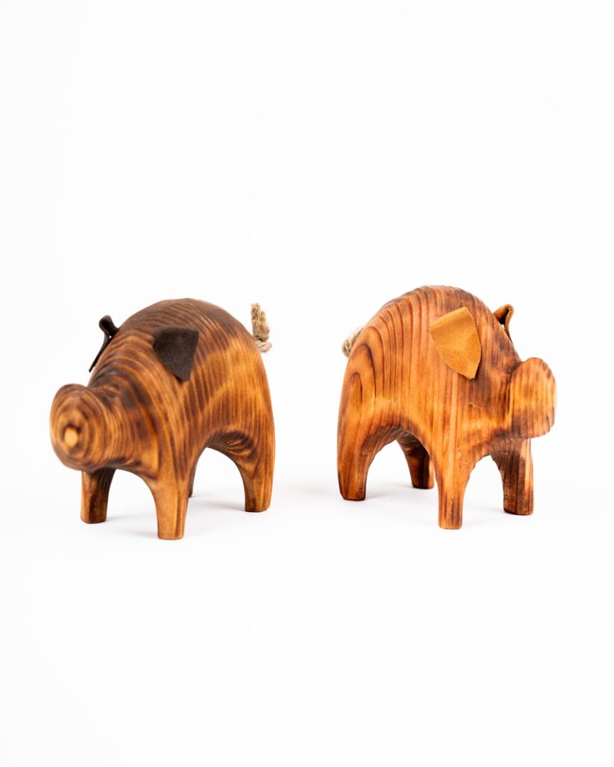 Vyrezávané prasiatko s koženými uškami zhotovené zo smrekového alebo dubového dreva. Výrobok je upravený technikou opaľovania.