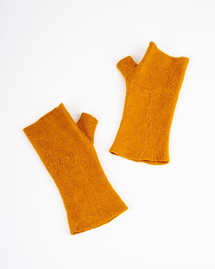 Bezprstové rukavice z ovčej vlny zhotovené technikou mokrého plstenia.