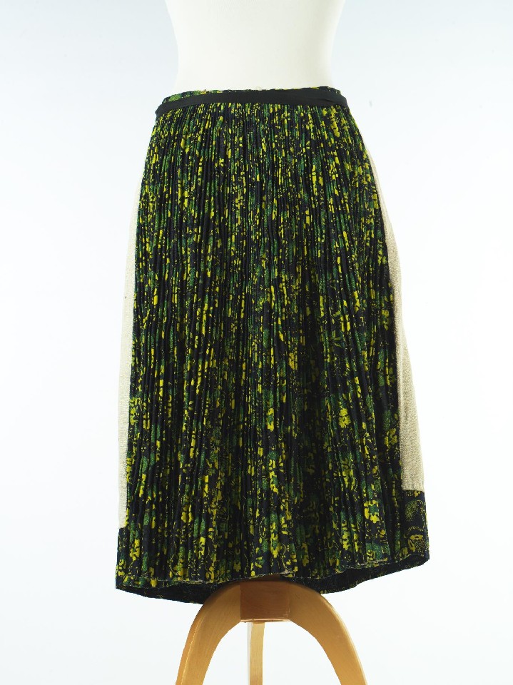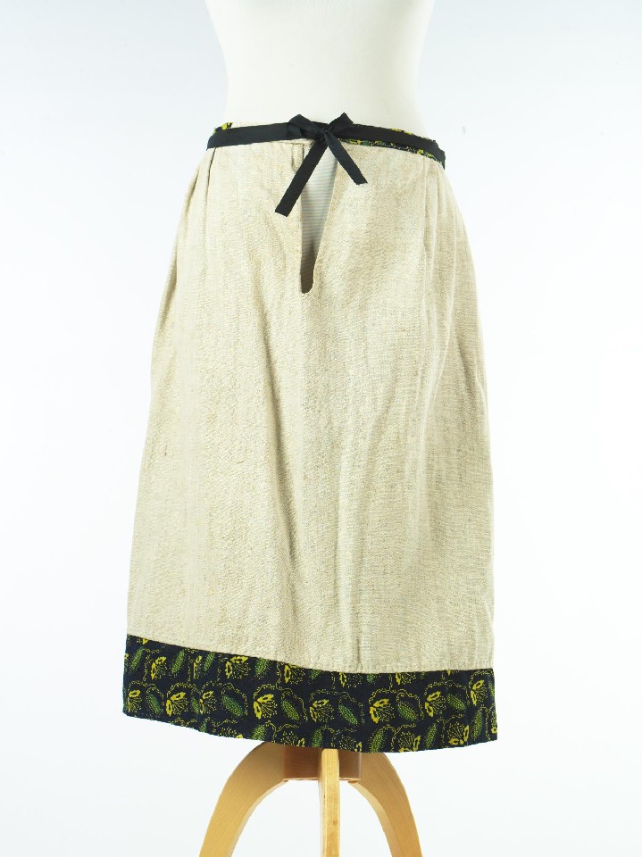 Sukňa je ušitá zo 4 pôl modrotlače natlačenej na domácom ľanovom plátne. Vzor je žlto-zelený. Predná, piata pola, je z ručne tkaného ľanového plátna. Dolný okraj je z rubovej strany podšitý pásom ľanového plátna. Sukňa je naskladaná do jednosmerných záhybov.