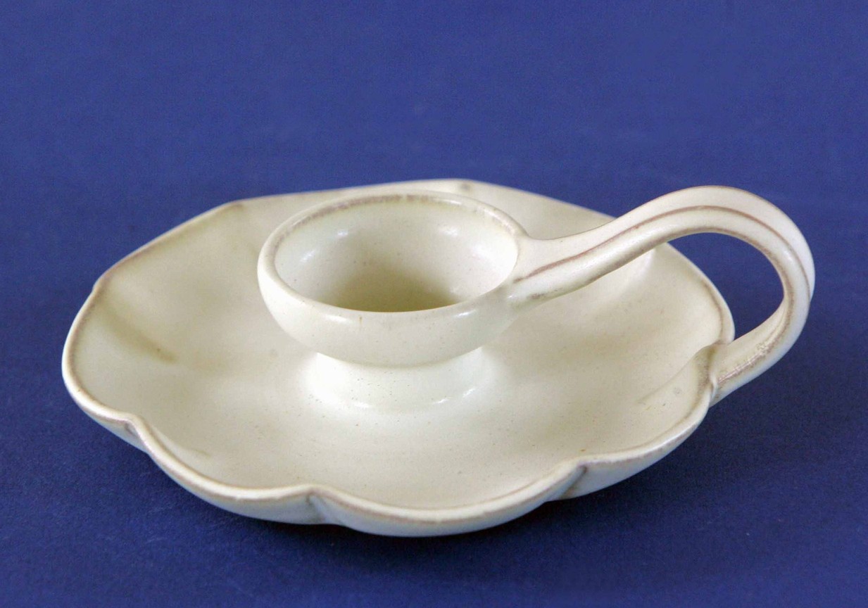 Svietnik s uškom, ručne točený na hrnčiarskom kruhu, z bledej kameninovej hliny. Stredná časť svietnika je vytočená s ozdobným vystúpeným reliéfom, spodný tanierik je domodelovaný technikou rebrovania. Glazovaný je v bielej matnej glazúre, ktorá sa krásne zachytáva na všetkých ohyboch hliny. Priemer otvoru na sviečku: 1,2 cm. Vysoký výpal zaručuje vysoké úžitkové vlastnosti.