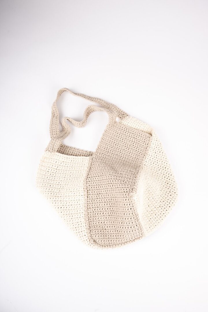 Taška zhotovená technikou háčkovania. Materiálom je dutý motúz, ktorý obsahuje 85 % bavlny a 15 % polyesteru.