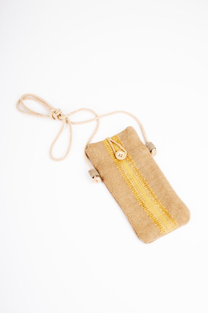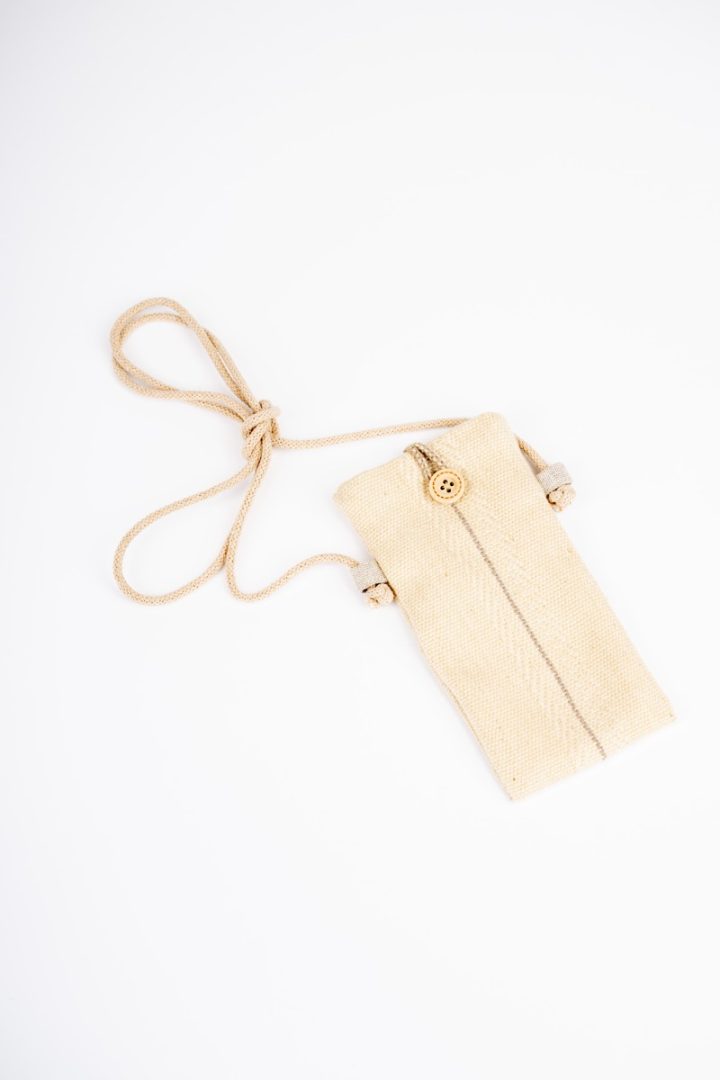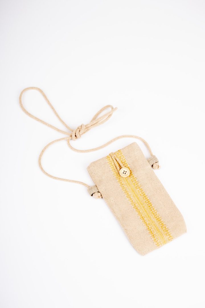 Tkaná taška na mobil alebo drobnosti. Tkanina je zhotovená z bavlny a ľanu technikou tkania na krosnách. Vzor je tradičný pre región Horehronie.