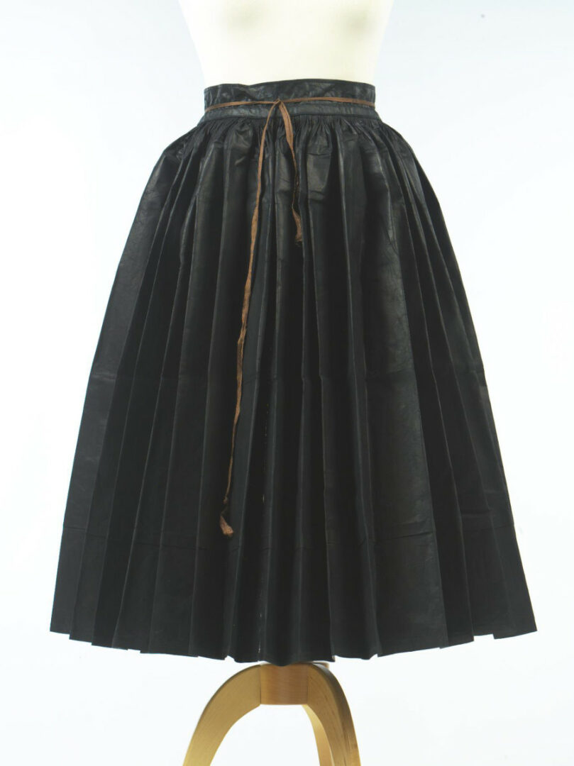 Zástera je ušitá z tmavomodrého farbiarského plátna. V páse je husto nariasená a všitá do širokého obalka, ktorý je ozdobne preštepovaný strojom. Zástera je naskladaná na stojaté záhyby. K obalku sú prišité hnedé umelohodvábne tkanice na zaväzovanie zástery.